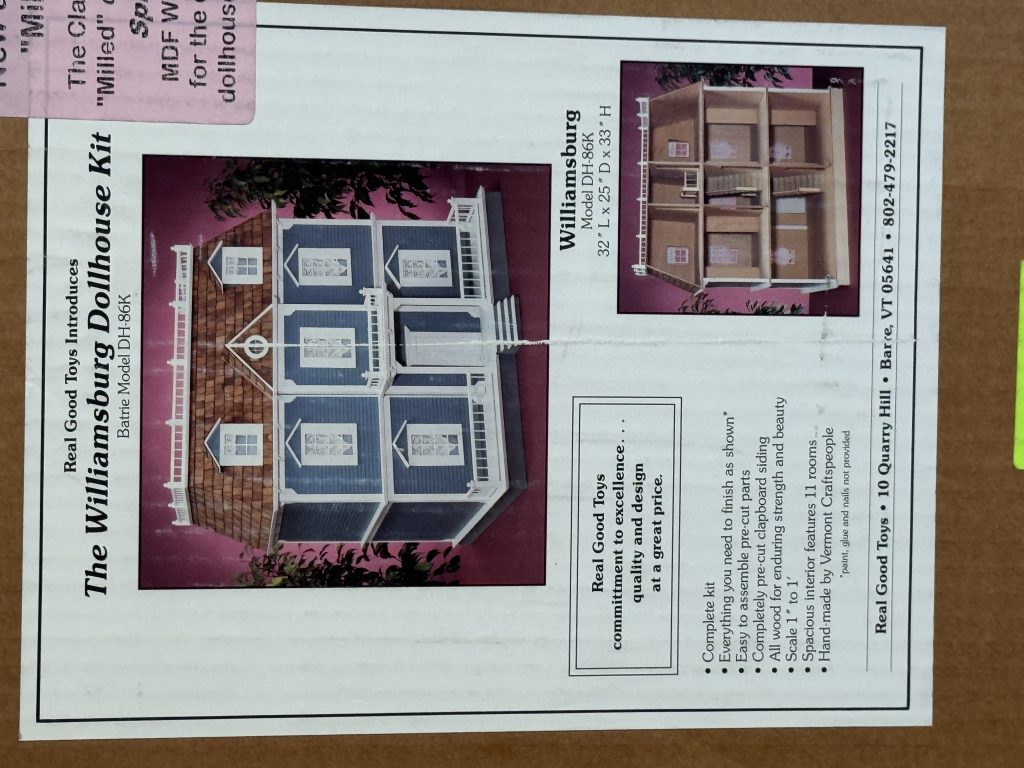 WHAT IS SAYS ON THE BOX: Complete kit as shown Everything you need to finish as shown* (*paint, glue, nails not provided) Easy to assemble pre-cut parts Completely pre-cut clapboard siding All wood for enduring strength and beauty Scale 1″ to 1′ Spacious interior features 11 rooms Hand made by Vermont Craftspeople