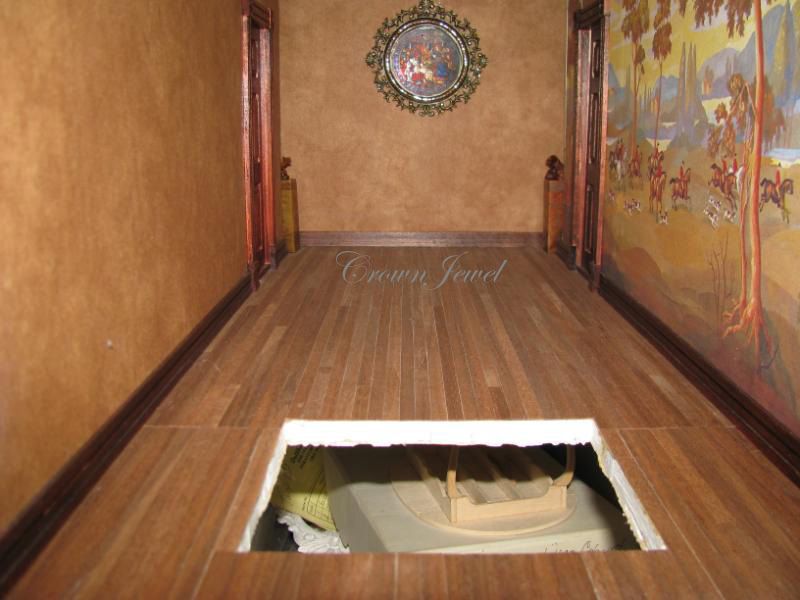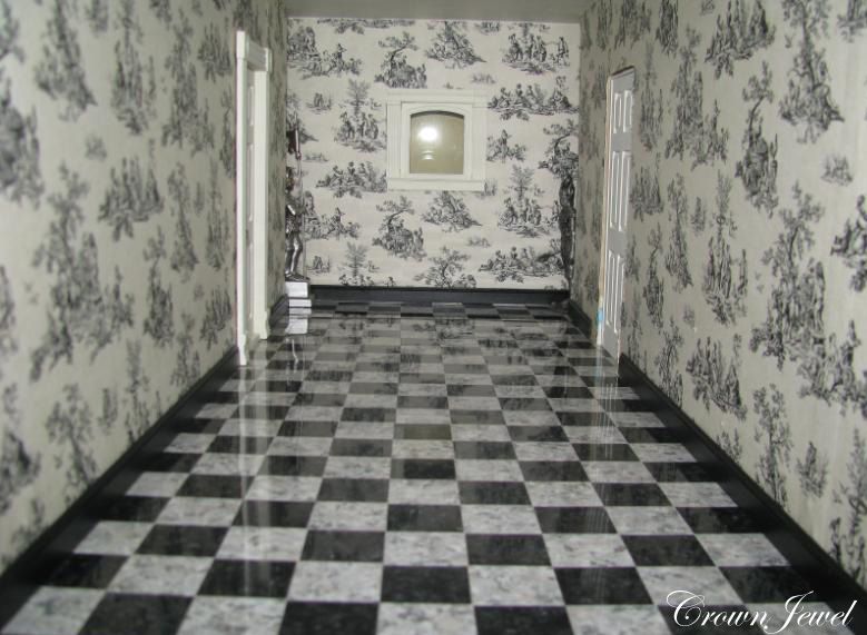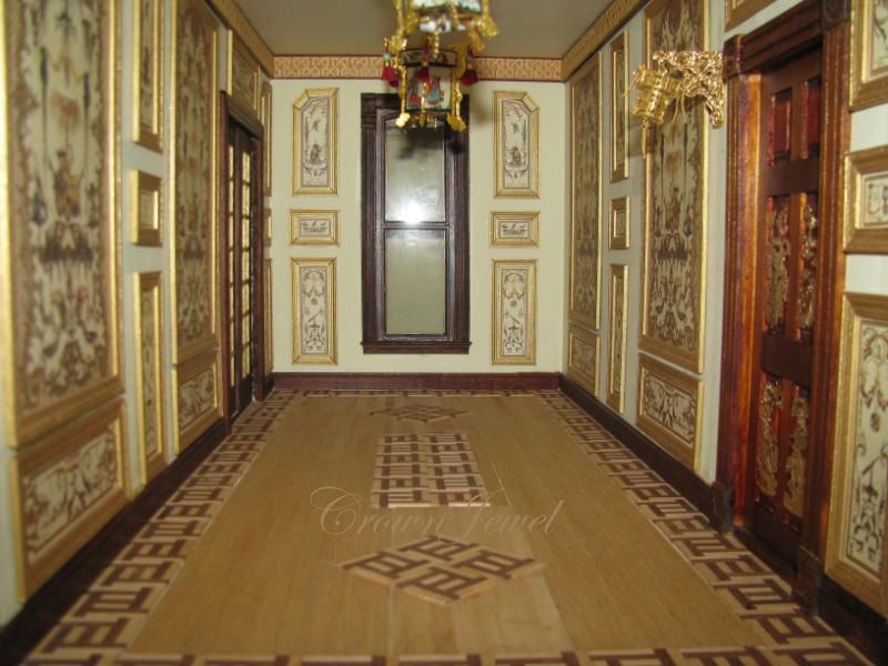 Welcome to Crown Jewel Manor, a 21 room work-in-progress housing my private collection.Crown Jewel Manor was built in 1994 by John DiMenna, of Stratford, CT. It is constructed of cabinet grade birch plywood with Lawbre glass windows and doors. The exterior of the manor was inspired by The Elms, the Newport, R.I. summer residence of Mr. and Mrs. Edward Julius Berwind of Philadelphia and New York. In 1898, the Berwinds engaged Philadelphia architect Horace Trumbauer to design a house modeled after the mid-18th century French chateau d'Asnieres (c.1750) outside Paris. The interiors and furnishings of The Elms were designed by Allard and Sons of Paris and while I did not follow through with such lofty aspirations for my interior, many of the rooms in Crown Jewel Manor do share one feature with the Elms... they are arranged enfilade, meaning you can stand at one end of the house and look down through a succession of open doorways to see clear to the opposite end! The Elms is located in Newport, R.I. Crown Jewel Manor is located in the Crown Jewel Imaginarium© and is something of a landmark there due to its size, as you might imagine. It came to me as a bare wood shell and I've done all the work, inside and out, myself. The interior boasts twenty-one rooms, some of which are as yet unfinished. It's a work-in-progress and I tinker with it in my spare time (LOL) when I can. The front steps and railings for the balaconies are not yet installed and the architectural elements on the facade are incomplete. I wired the manor with 12-volt electricity and installed lighting in most rooms. I made several of the chandeliers myself using kits by Phyllis Tucker and Kadelli. Other lighting includes lamps, fixtures and chandeliers made by Barbara & Lew Kummerow, Nicole Minnick of Ni-Glo, Phyllis Tucker, Clare-Bell Brass Works, Rosel's, Jeri Futvoye and several other artists. The walls have been primed, papered and finished with a variety of mediums to achieve various styles. Almost all the floors are in and many have inlaid marquetry features that I made by cutting up sheets of wood flooring. Other rooms such as the bathroom, butler's pantry, kitchen, etc have tile floors or other finishes. Very few rooms are complete! Many still need additional crown, door and baseboard molding. Most of my furniture and accessories are currently in storage until the mansion is complete but I have partially furnished some rooms with odds and ends to provide you with something more interesting to see than photos of bare spaces. It is my hope that Crown Jewel Manor will inspire other miniaturists. Trust your imagination and build your dreams! With a little inspiration and a lot of effort, you too can build an heirloom. Feel free to contact me with questions and comments!